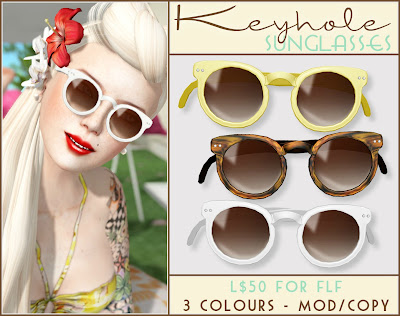 3 pairs of keyhole sunglasses! White, yellow and tortoiseshell, 3 attachmentpoints. Mod/copy and there is a demo available. :)